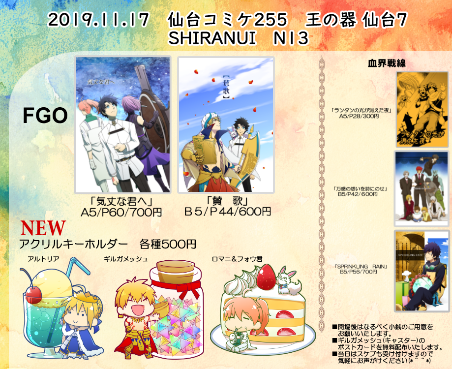 2019/11/11 Category : お知らせ 11/17の仙台コミケ255内で開催される「王の器仙台7」に参加します! お知らせです! 11/17に開催される仙台コミケ255「王の器 仙台7」に参加します! スペースはN13となっております。 今回は初めてアクリルキーホルダーを作ってみました! ナスカンは王冠です^^ 今回は久し振りにスケブも頑張ろうと思いますので気軽にお声がけください! PR